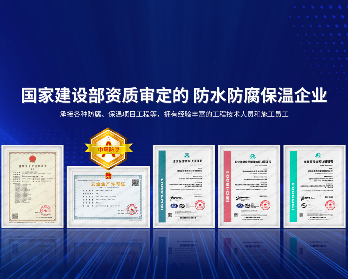 公司經營范圍:防水防腐保溫工程;消防設施工程;建筑裝修裝飾工程;建筑機電安裝工程;電力工程;建筑工程;石油化工工程;工業清洗工程;油罐清洗工程;鋼結構工程;環保工程;模板腳手架工程;電纜防火封堵、防污閃噴涂、外墻外保溫工程;各類施工勞務作業;設備維修、船舶鉚焊、涂裝;電力工程材料、建材、防水材料、防火材料、防腐保溫材料銷售,并相繼通過了GB/T19001-2008idtISO9001:2008GB/T50430-2007質量管理體系認證證書。GB/T24001-2004idtISO14001:2004環境管理體系認證證書。GB/T28001-2011idtOHSAS18001:2007職業健康安全管理體系認證證書。公司是中國防腐蝕于防護協會、中國施工企業管理協會、電力協會和中國鋼結構防水協會會員單位。 公司的經營業務涵蓋了石油、化工、電力、冶金、煤炭、船舶、國防、燃氣、水利、環保、交通運輸、航空及國防軍工和輕紡市政等行業的防腐保溫絕熱設備。鋼結構安裝、防火、防水、金屬噴鍍、聚脲噴繪、陰極保護、防滲透堵漏、玻璃鋼及各種磚版材料襯里、橡膠襯里、煙氣硫和耐酸溶劑腐蝕等工程施工。公司連續十年榮獲“省市先進施工企業”“安全生產先進單位”“重合同,守信用企業”和“AA***資質企業”的稱號。2000年被命名為市級文明單位,2002年被國家工商行政管理局命名為“重合同,守信用的企業”、被中國工業防腐蝕技術協會命名為“防腐蝕企業,能源節約及環境保護領域有豐富的經驗和***的業績。工程一次交驗合格率100%。其中攀枝花鋼鐵公司煉鐵廠四號高爐及熱風爐防腐工程、上海寶鋼公司煤氣柜防腐工程、撫順石油一廠裝置防腐項目、齊魯石化公司稀烴廠高塔防腐工程、吉林化學工業公司煉油廠油罐防腐工程、天津石化熱電廠六號爐頂棚聯絡管保溫工程、大慶油田(太倉)力神泵業工程、中國化學工程第十一建設工程、中原油田勘探局工程、中國石化銷售有限公司華北分部、魯皖輸油管道工程、貴州開磷息烽合成氨工程、陜西黃陵煤化工程、中國石油天然氣西部管道塔里木輸油工程、邯鋼集團邯寶鋼鐵公司煉鐵工程、德州供電工程、吉寶(南通)船廠工程,偃師華潤熱力工程、鄭州熱力總公司。 河南省中惠防腐安裝有限公司愿以豐富的施工經驗,***的技術,***的設備,***的管理,***的服務,竭誠為國內外廣大的用戶提供***滿意、******的工程作品。 我公司愿與國內外同仁一道,團結協作,共同推進防腐蝕行業發展! 公司地址:河南省長垣縣建設路北段360號 固定電話:0373-8866488 郵編:453400 網址:http://www_zhff_com_cn.shdairui.com